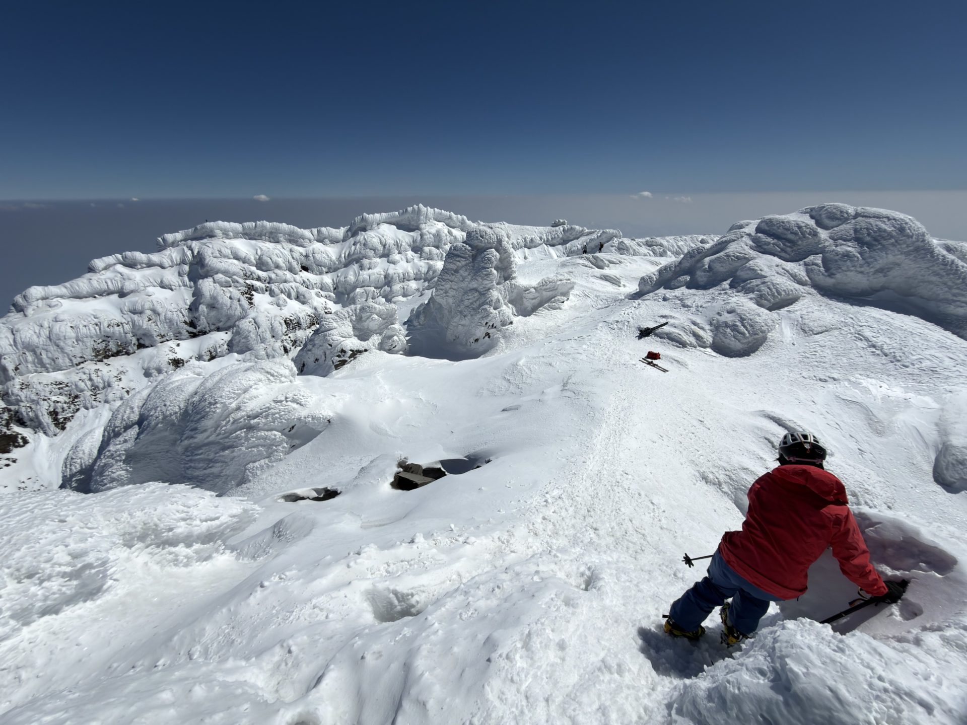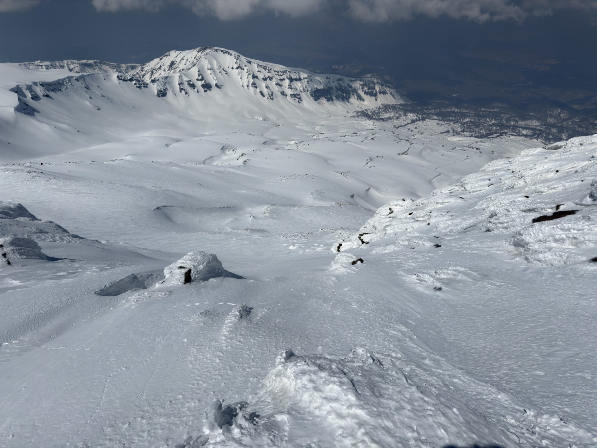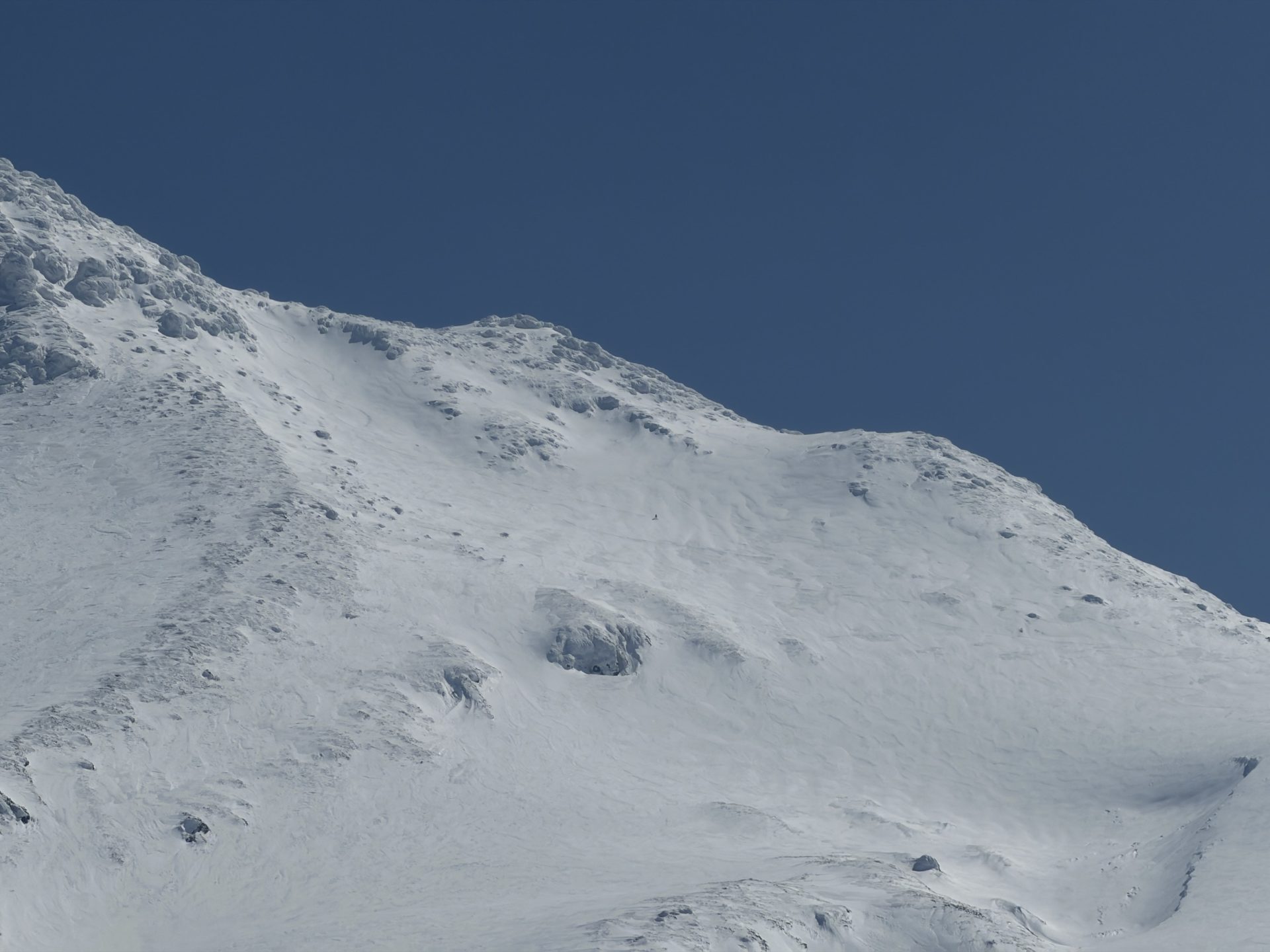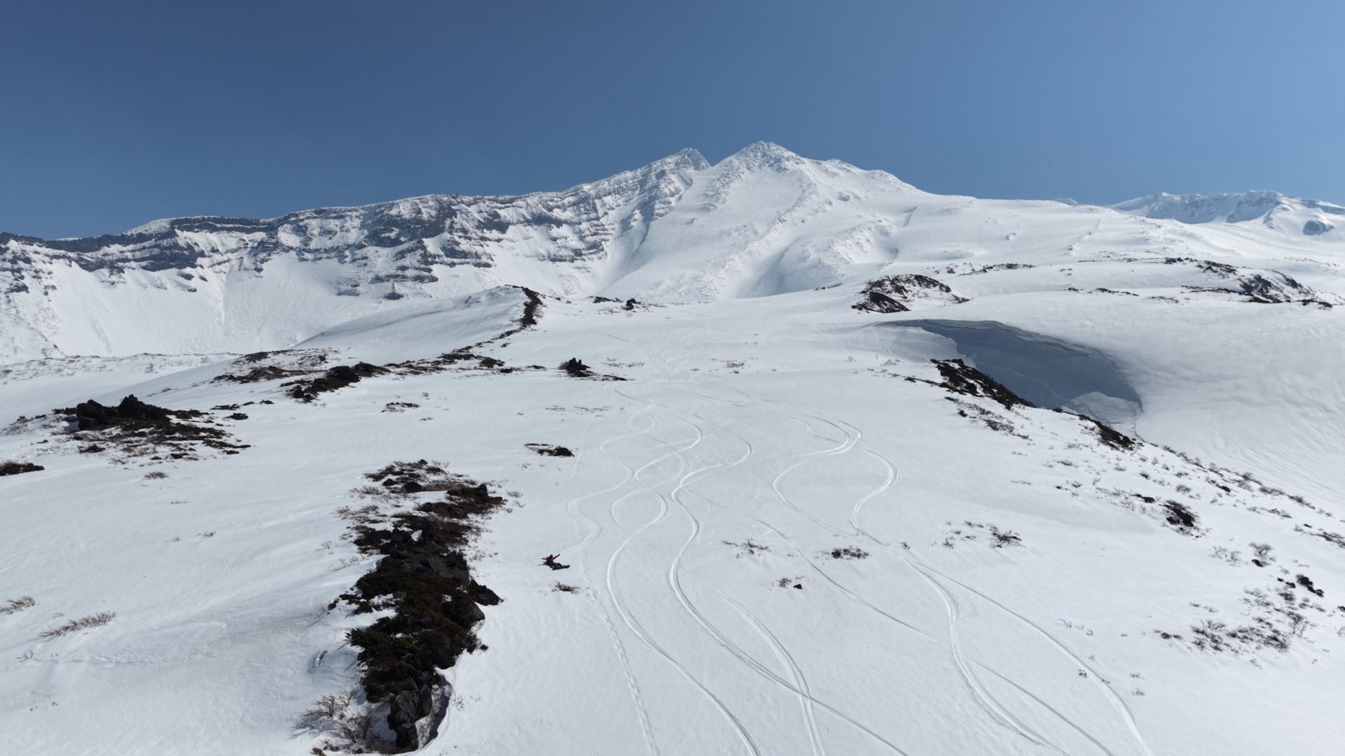 いろいろ物色したのだけど、3月でも山頂北側は綺麗に繋がっておらず、以前5月にこっち側滑った時と同じドロップ地点となりました。