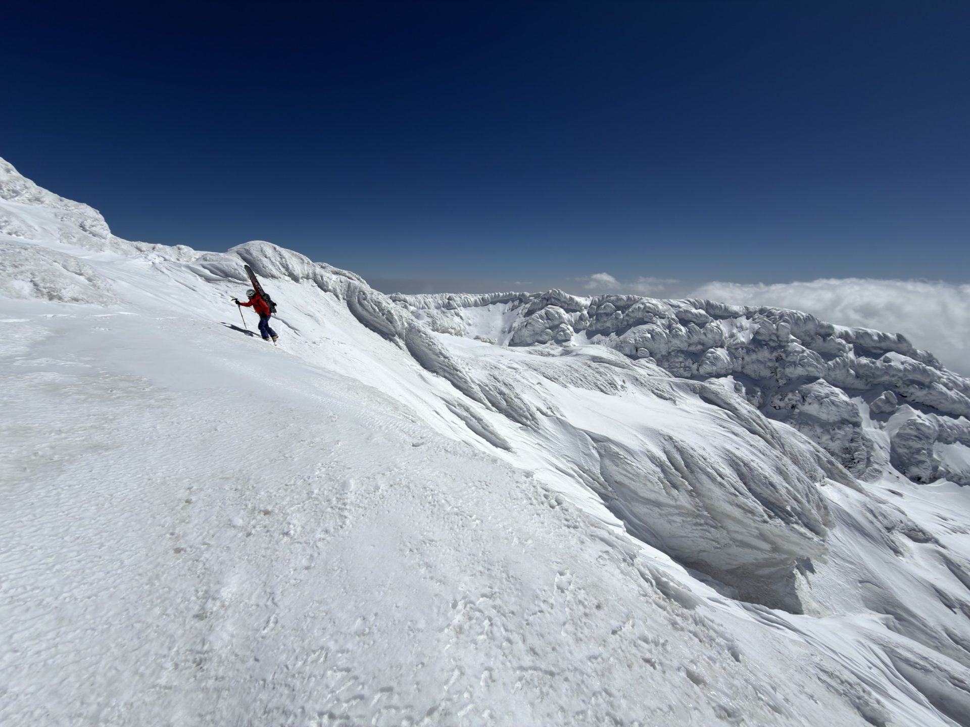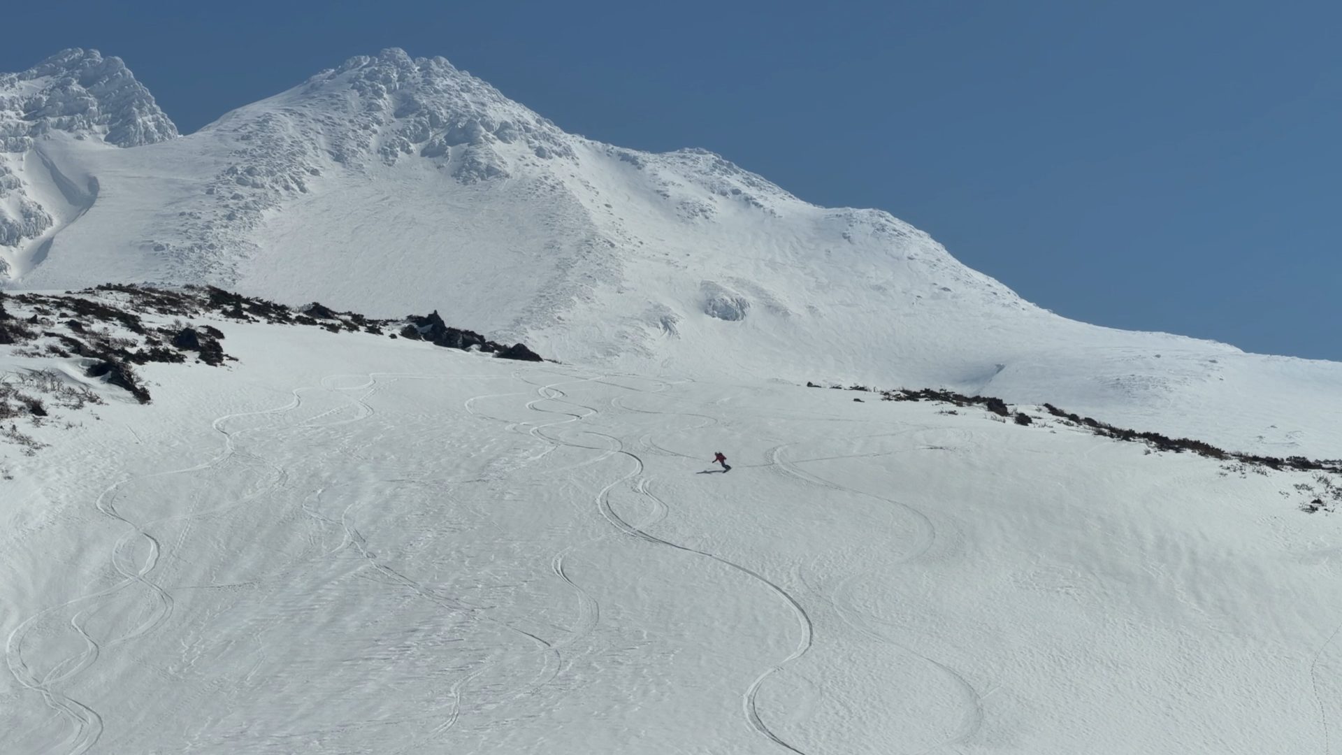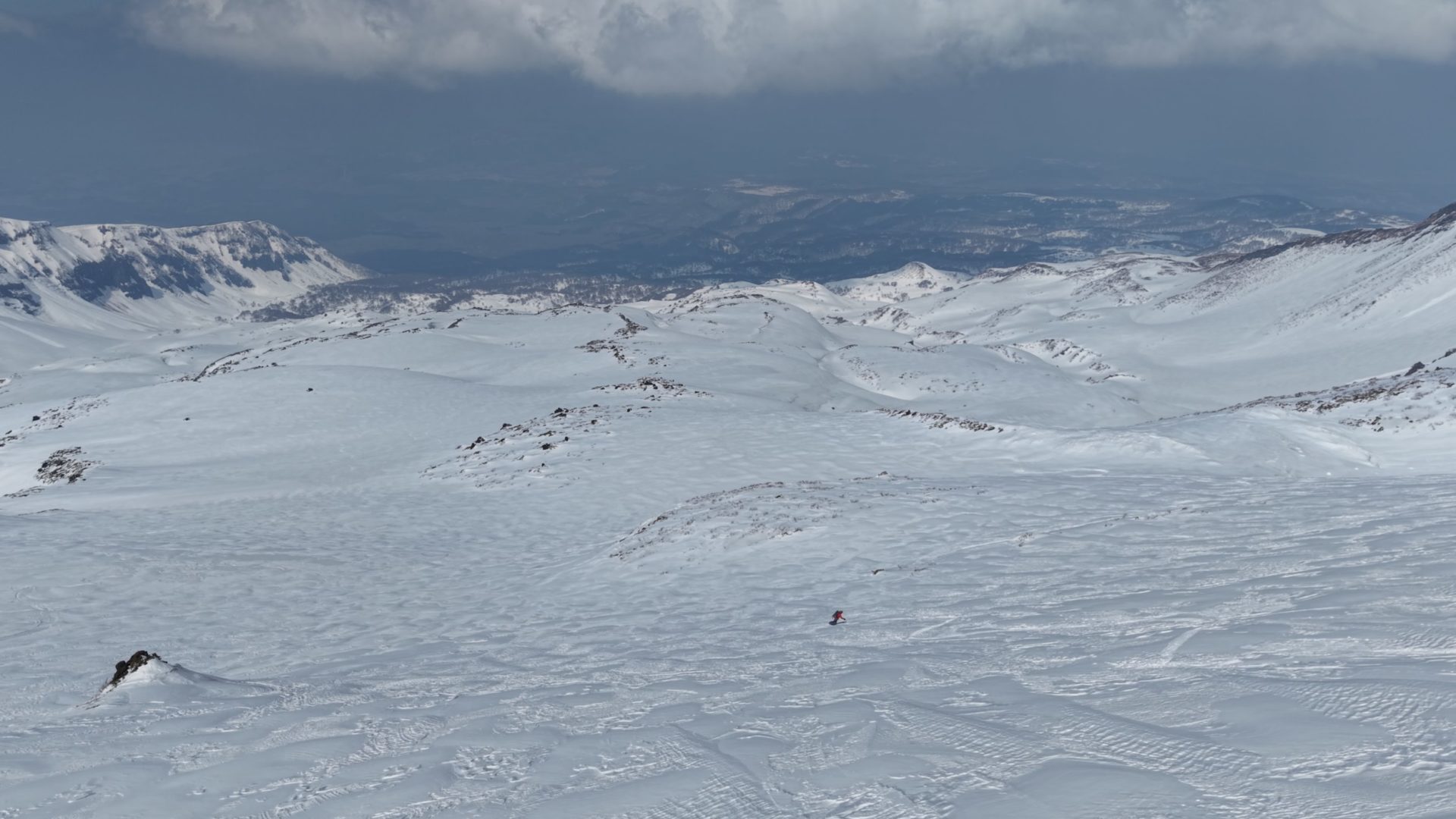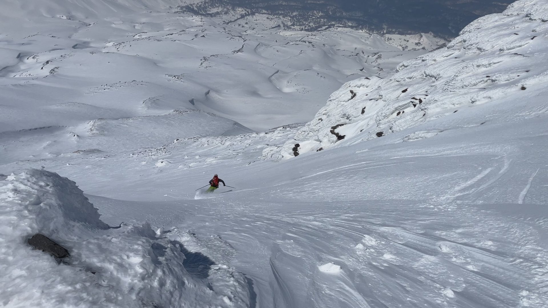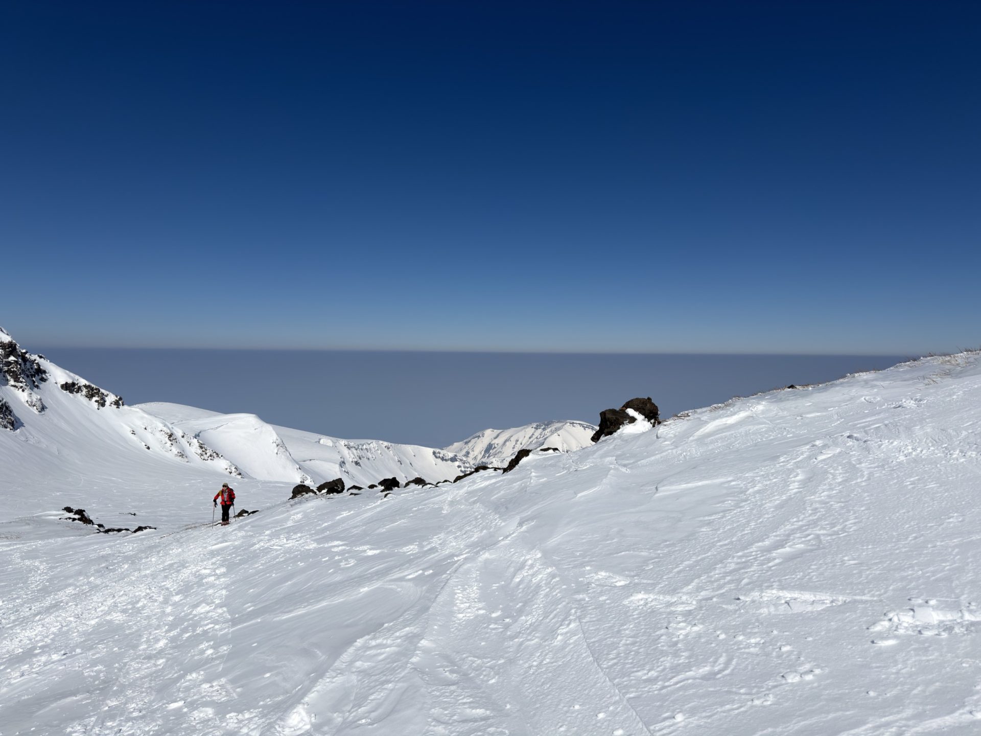 いろいろ物色したのだけど、3月でも山頂北側は綺麗に繋がっておらず、以前5月にこっち側滑った時と同じドロップ地点となりました。