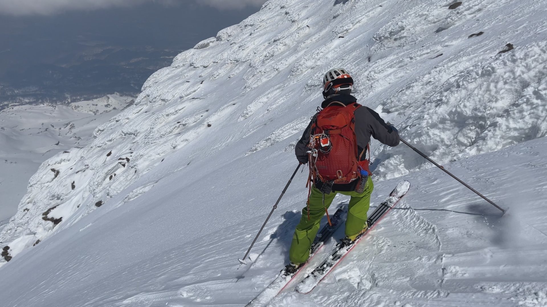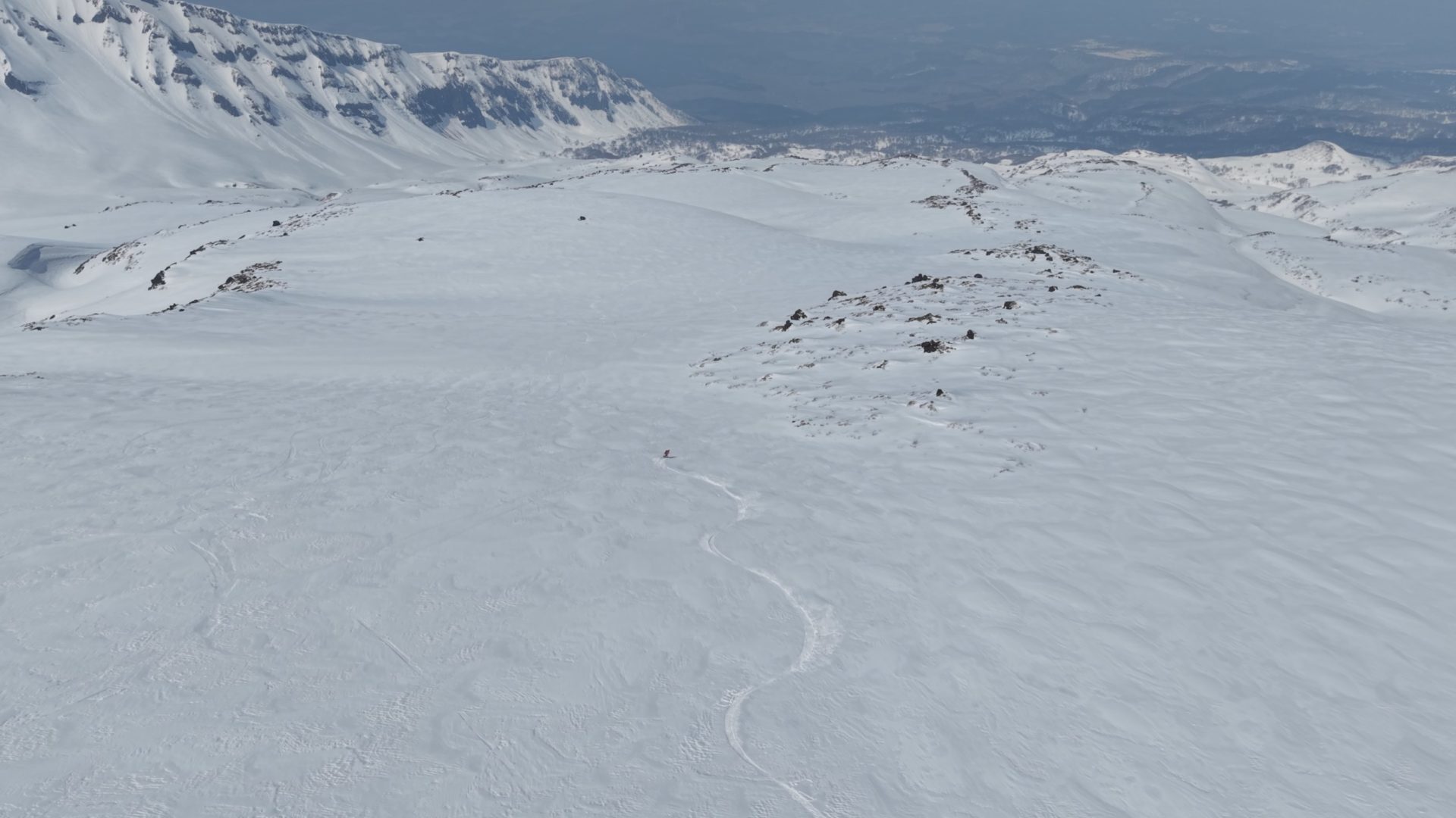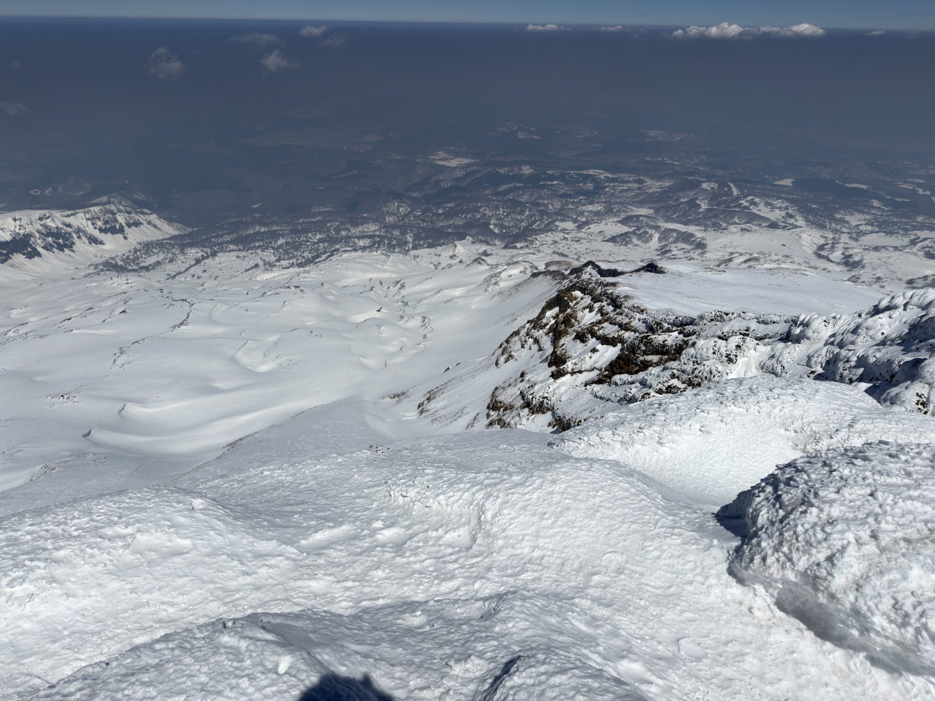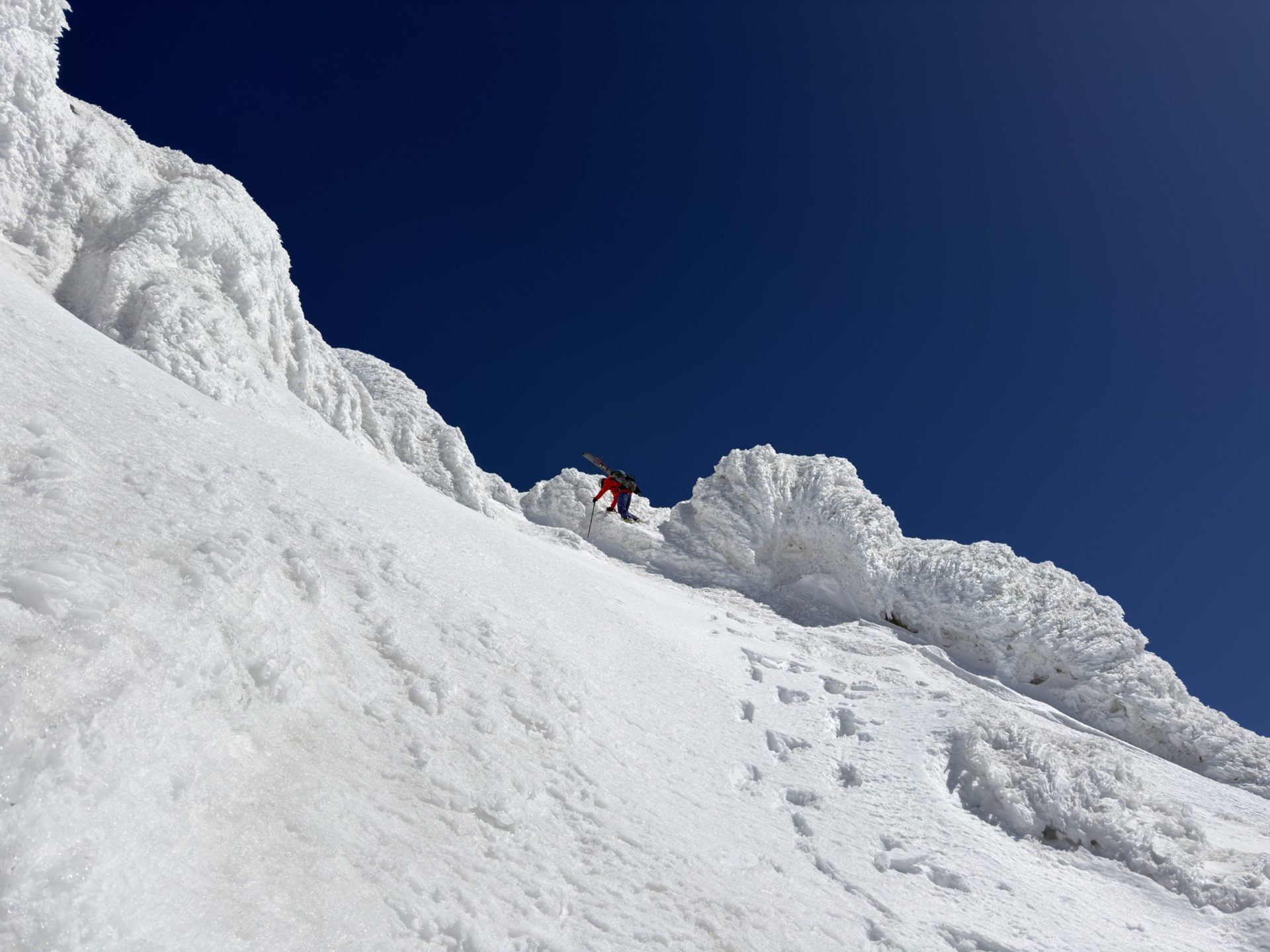 いろいろ物色したのだけど、3月でも山頂北側は綺麗に繋がっておらず、以前5月にこっち側滑った時と同じドロップ地点となりました。
